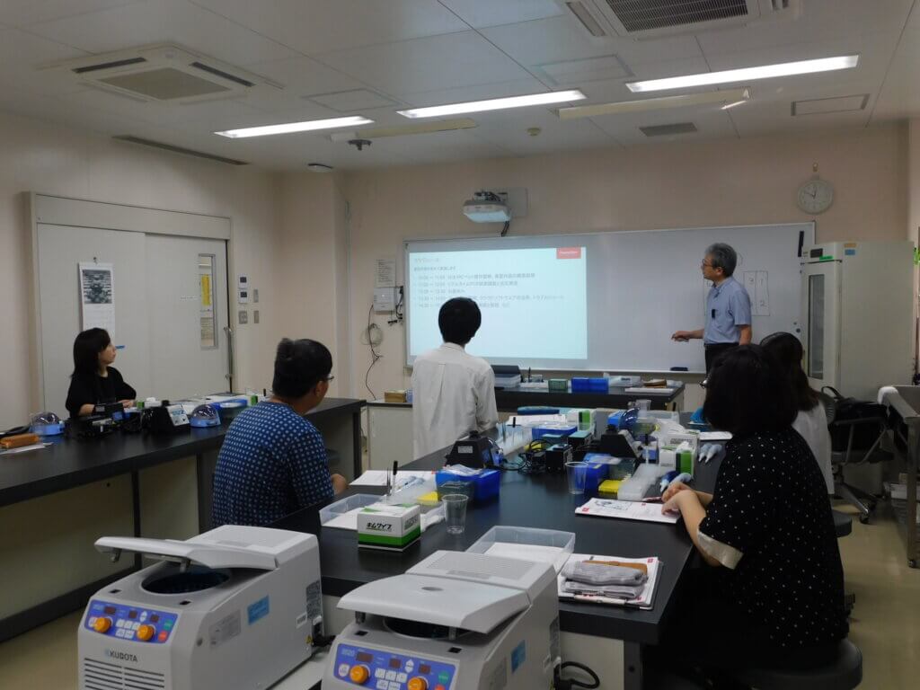 1日目は、遺伝子実験部門セミナー室において、リアルタイムPCRの基礎理論や解析手法に関する講義、ならびにStepOnePlusリアルタイムPCRシステムの使用説明が行われました。