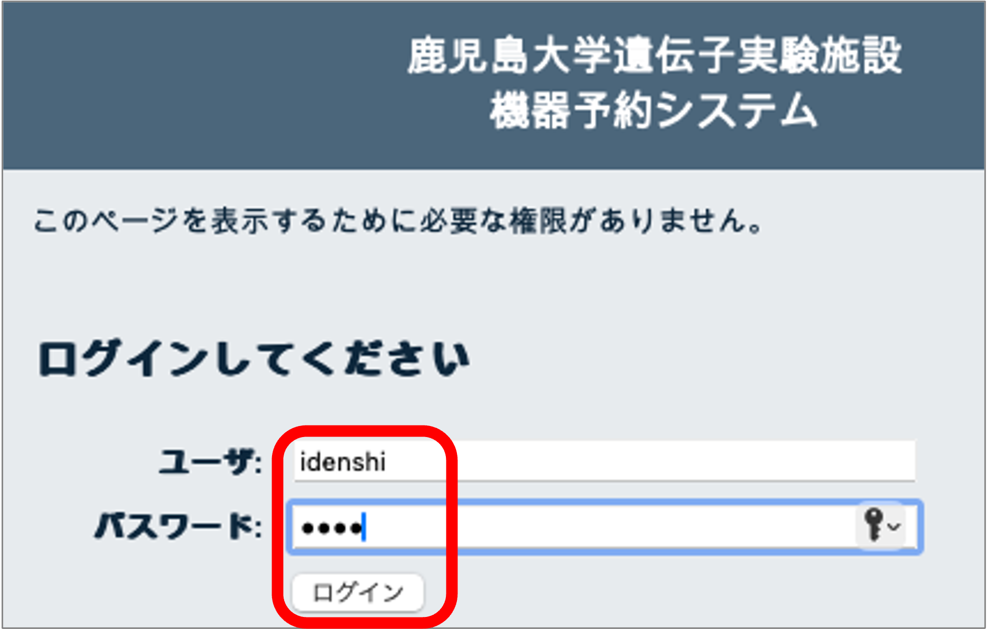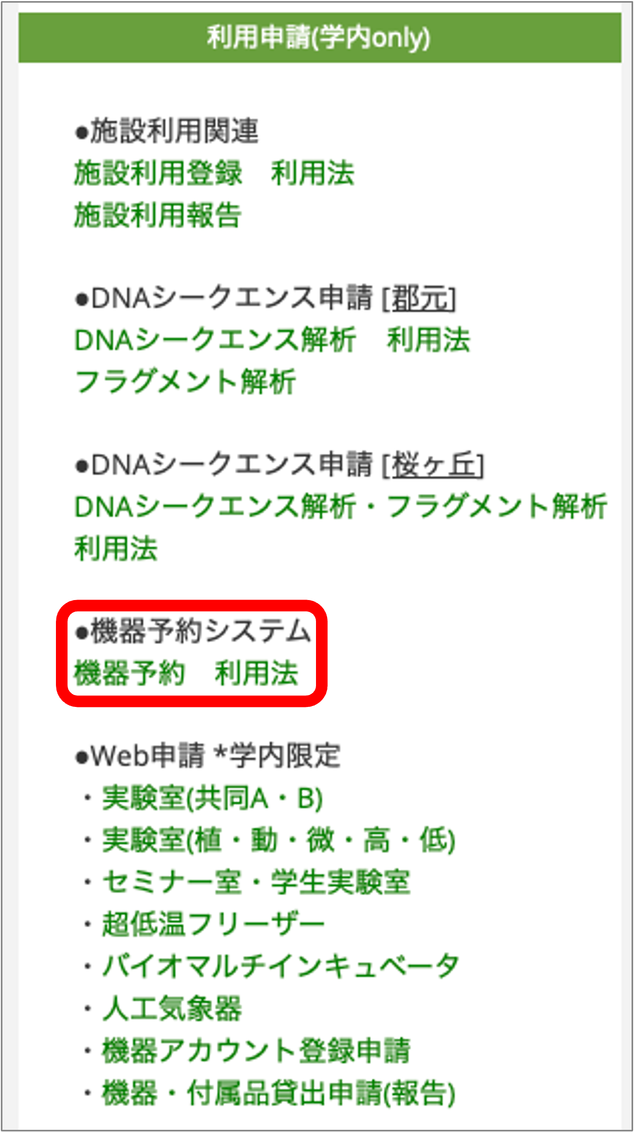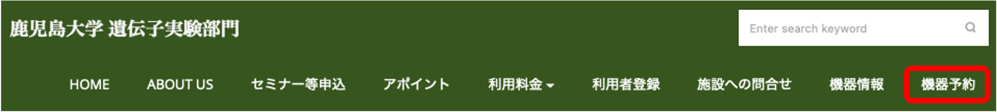 ・ホームページの上部メニューまたは左メニューにある「機器予約」をクリックします。