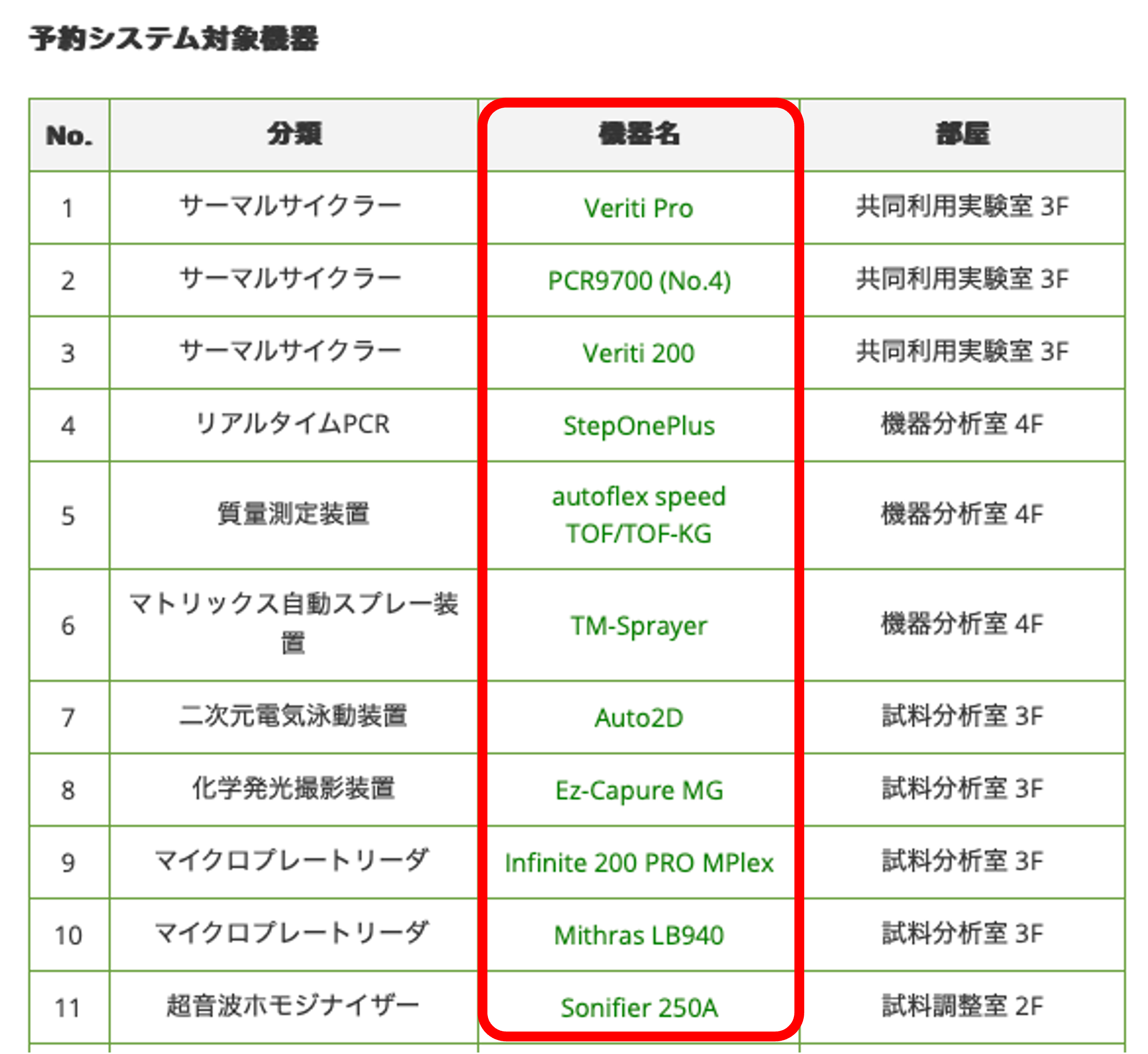3. 機器予約システムに未登録の機器や実験室の利用料金は表示されません。