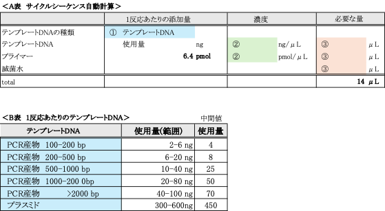 *提出した混合物の半量(7µl)をサイクルシーケンス反応に使用(10µl反応系)こちらの「テンプレートDNA自動計算シート」を使用すると、テンプレートDNAのサイズや種類を選択すると必要量が自動で計算できます。